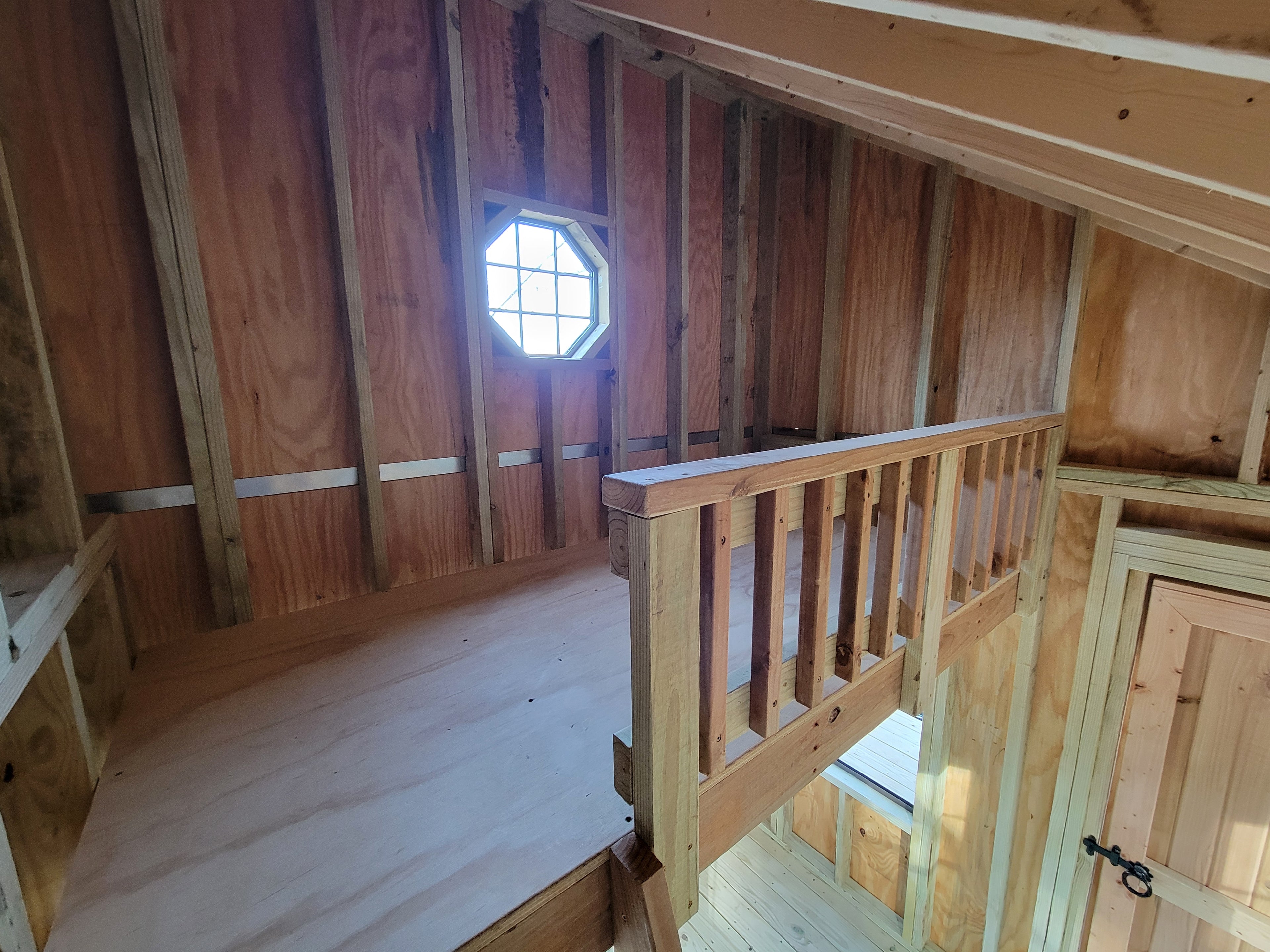 The 1-Illinois is an 8’ x 8’ treehouse on a 16’ x 8’ platform. It has a high one pitch asphalt roof, 3’ x 8’ internal loft, stained T1-11 siding, wooden baluster railings, rock climb, bucket lift, and 30’ rope bridge across a small creek.