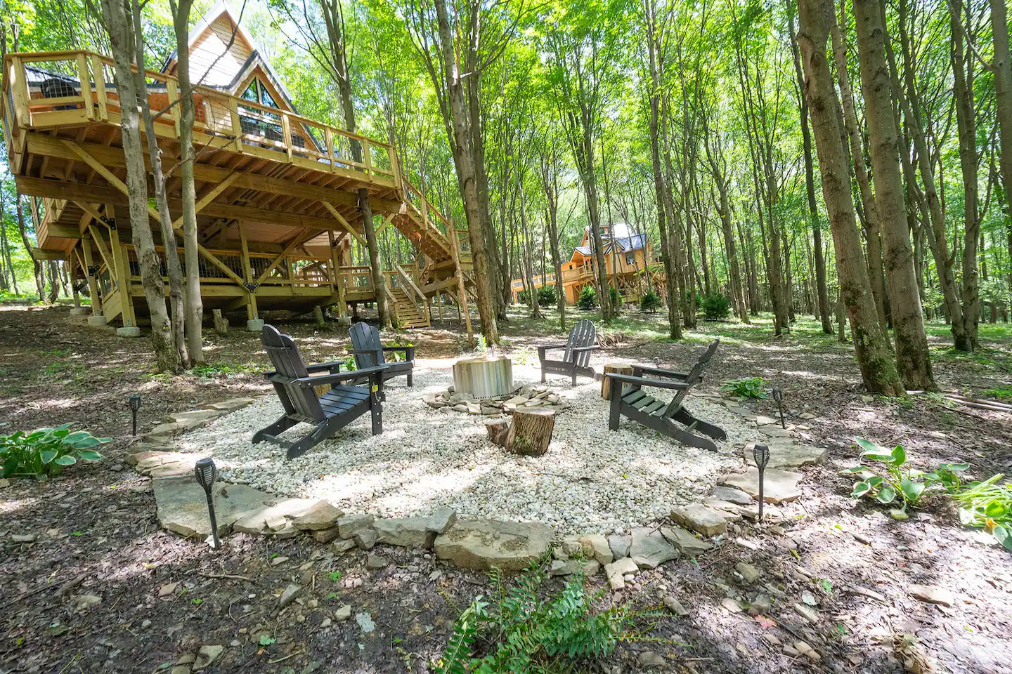 Nestled high amidst the sturdy branches, "Bird's Eye View" is a sanctuary suspended between earth and sky. Located less than 5 minutes from Deep Creek Lake and perched among the foliage, this stunning vacation treehouse offers a panoramic perspective of the surrounding forest, granting its visitors an unparalleled vantage point to observe nature's wonders.