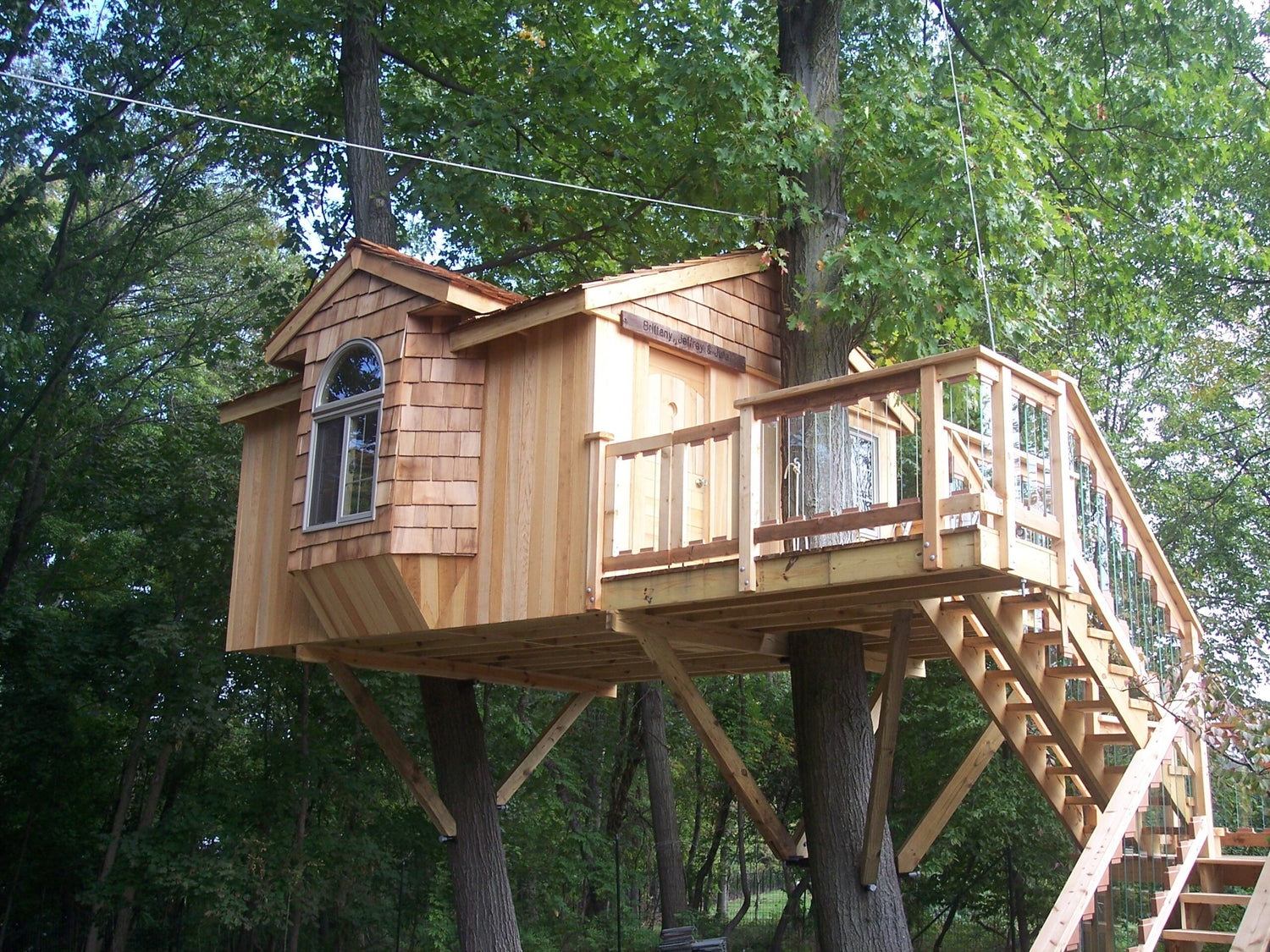 We are proud to introduce the 14 - Pennsylvania Treehouse and the story behind its creation. In 2008, Pennsylvania was the center of the tree house-building world. Three fantastic tree houses were built at Longwood Gardens, where we installed siding on the tree house designed after a Norwegian Cathedral. The Tyler Arboretum also has a large tree house art exhibit. All in all, the main line was buzzing all year with tree houses everywhere. At the end of the summer, we built this fantastic tree house for three lucky kids in Bryn Mawr to play in and around. It has a zip line outside and a hidden storage compartment inside. It is built in 2 strong red oaks.