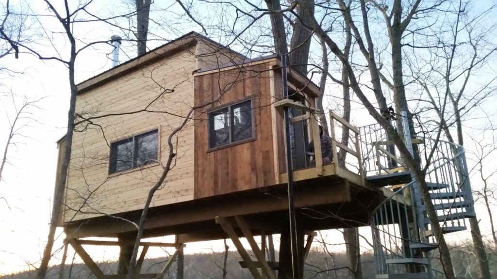 This treehouse is over 20ft in the air and built around two trees, one of which goes straight through it. All-natural hardwoods were used throughout this treehouse build, from the walls to the floors to the siding. We paid particular attention to how we situated this treehouse so that we could enhance the views.