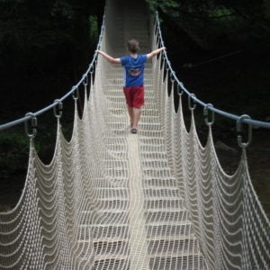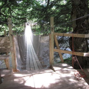 Although this bridge and stream are beautiful, the main purpose of the YMCA Rope Bridge project is to get hikers and campers an easy way to access hundreds of acres of trails on the other side, where no road crossings are possible. We can build bridges in remote areas and usually find ways to tackle difficult or intimidating bridge and treehouse projects. We can determine whether it is better to construct ground-based towers or use trees for support and evaluate whether to use trees or ground anchors for support.