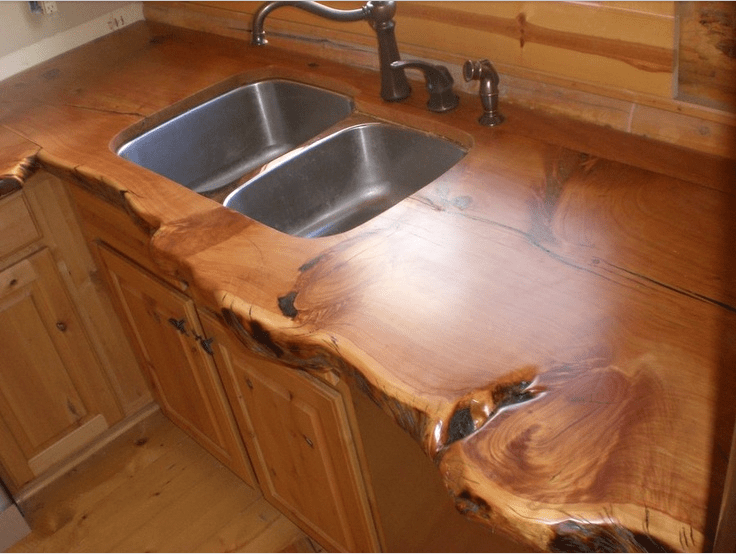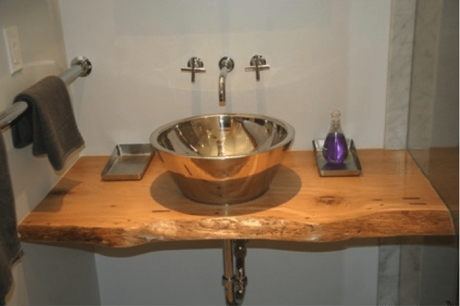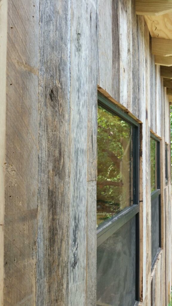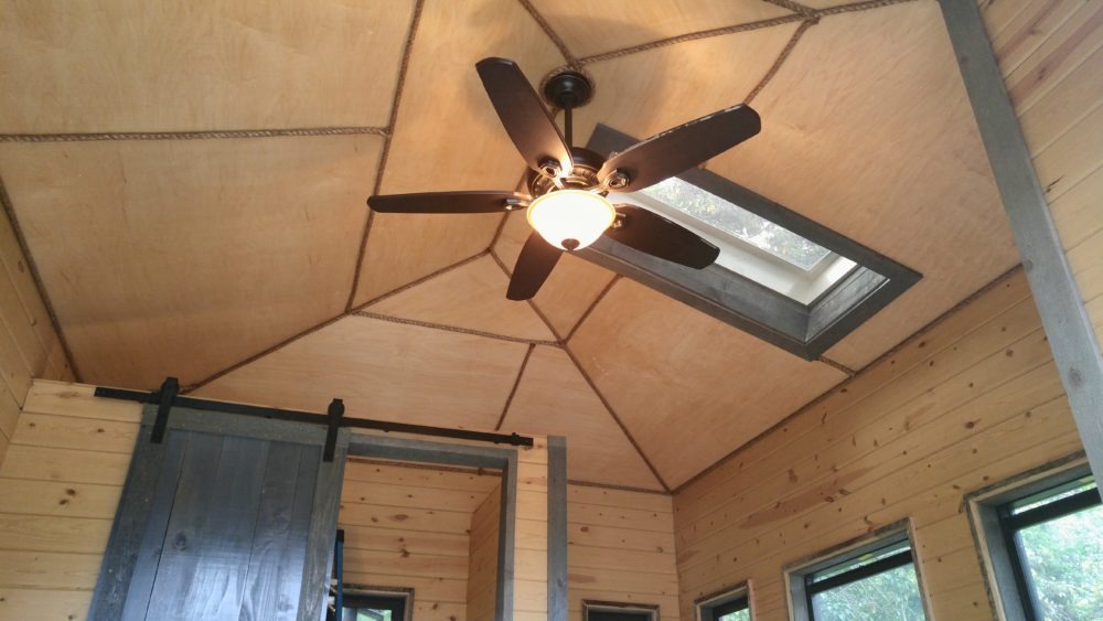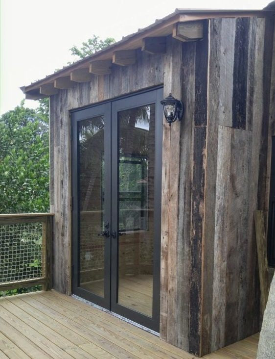 We found some unique and exciting materials to give this treehouse extra character. The countertop is a live edge spalted maple piece from a local hardwoods supplier. Some smaller parts of matching maple were fashioned into corner shelves and side tables. The rope trim fits right in near the pool. We sourced some reclaimed barn siding for the exterior of the treehouse. We love the sliding barn door inside and the skylight.