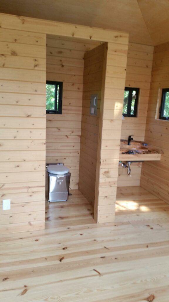 Our client wanted a complete steam shower to make their guests feel like they're at a spa. This location could not accommodate sewage lines, so we installed an incinerating plumbing system and stocked it with biodegradable products. For the electrical plan, we used a bronze finish on all fixtures to tie in with the doors and windows. The bathroom and kitchen have area lights, the ceiling fan has a room light, and outdoor lights guide your way after a swim.