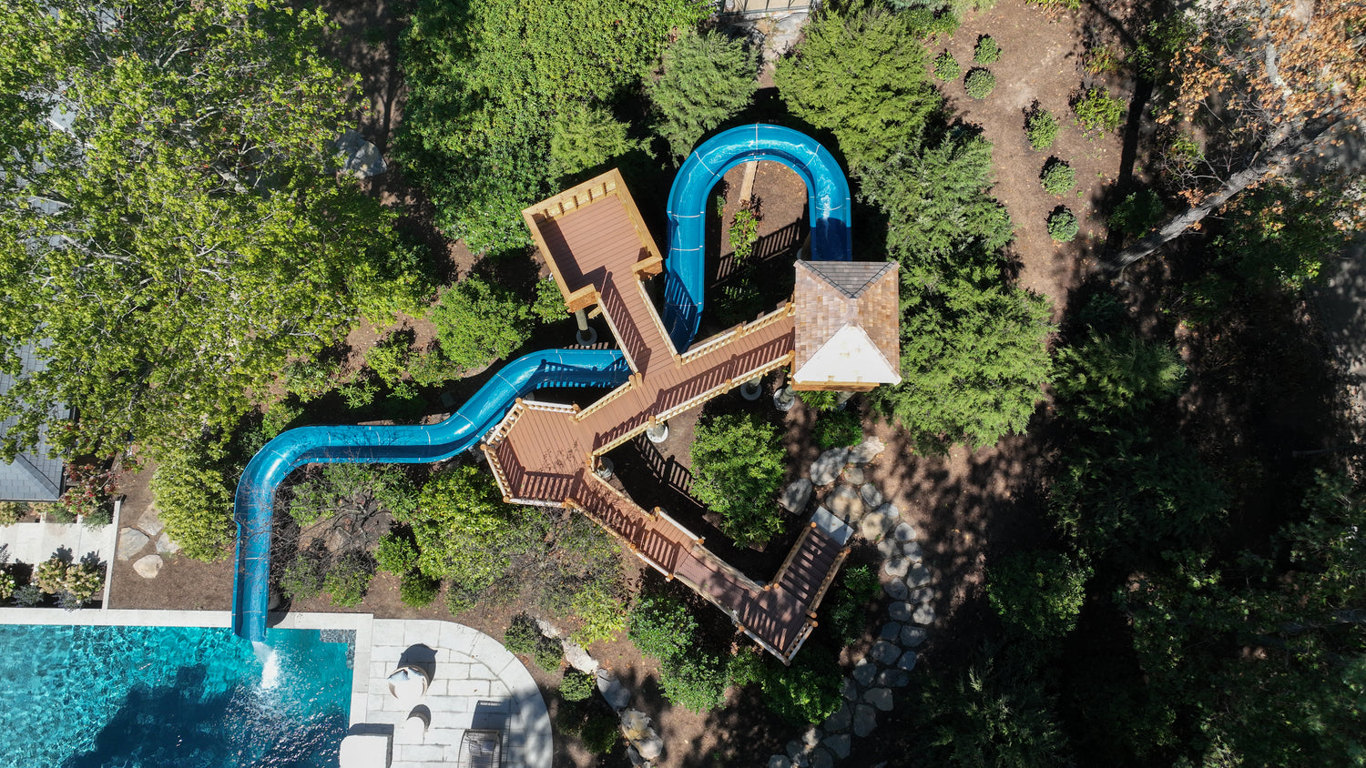 Building a treehouse with a waterslide takes the concept of a nature escape to a whole new level.