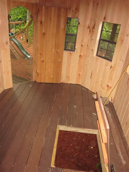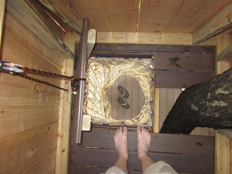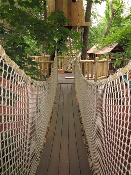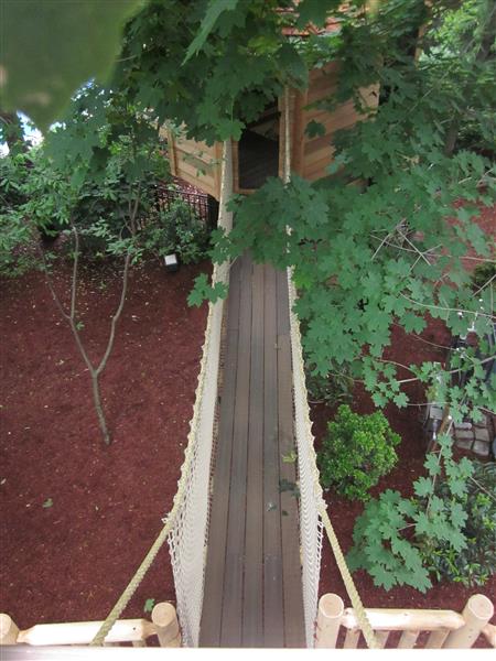 This is the bridge viewed from the back door of the treehouse. The crow's nest is visible above the open platform as you walk across the bridge.